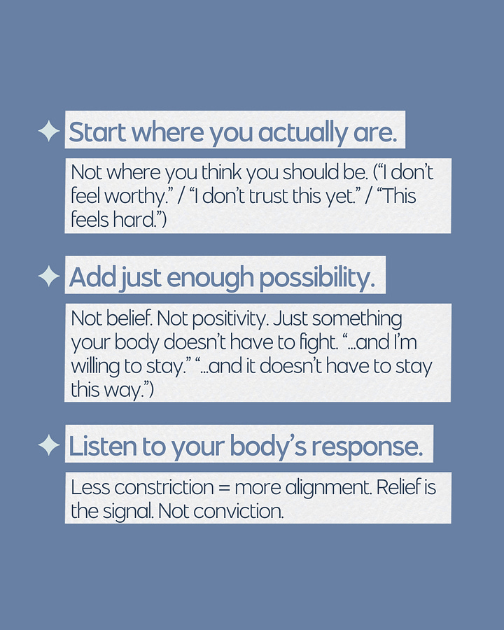 My DIY affirmation worked not because it was positive, but because it was true enough. It acknowledged where I was while peeking into a possibility my nervous system could tolerate. It didn’t demand belief — it invited me to be in relationship with myself.
